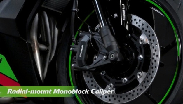 Sokbreker model terbalik ini, punya fungsi berbeda antara tabung kiri dan kanan yang menggunakan piston gede. Di sisi kanan sokbreker ini, terpasang kaliper cakram depan bertipe monoblock dengan radial mount. Hmm..laiknya moge ya, komplit dengan ABS alias antilock braking system