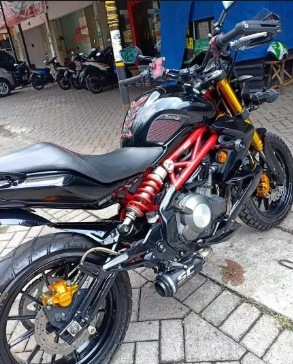 Sebagai pemanis, rona emas alias gold dilaburkan pada tabung sokbreker depan upside down, kaliper rem depan dan belakang. Ala-ala cat candytone. Sementara, lampu depan kini diisi lampu proyektor yang aplikasi bohlam HID dengan model orisinal. Terpasang pula produk ala cocor bebek, yaitu spatbor tambahan custom yang diposisikan di bawah lampu depan.