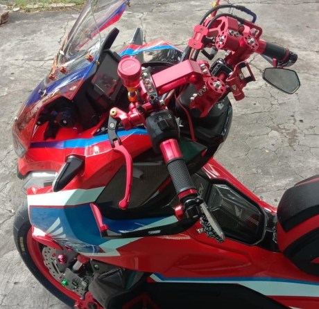 Di sektor kemudi, mulai tampak modifikasi. Setang lebar bawaan ADV150 dilengserkan. Berganti dengan setang kemudi ala robot. Berbahan almu CNC, setang berkelir merah ini terpasang rapi di atas segitiga. Masih dilengkapi pula tuas rem bermodel serupa, CNC warna merah dan tabung minyak rem warna senada di kanan dan kiri, serta panel monitor layar LCD 5 inchi sebagai pemantau kondisi belakang yang terhubung dengan kamera mungil di buritan. Mantappp