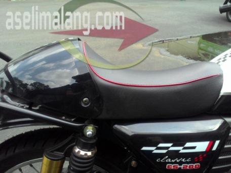 Fisiknya, didukung tangki besar bermodel klasik, ala-ala tetes air. Kapasitasnya lumayan gede, sanggup muat 15 liter BBM. Disambung dengan jok tebal berundak. Berundak di bagian belakang alias pembonceng, yang ujung belakangnya mirip buntut tawon. Rada mengecil sih, tapi masih nyaman kayaknya dipakai boncengan. Bahkan, dilengkapi penutup fiberglass nih, yang bisa dilepas-pasang, kala pingin berkendara sendirian dan egois 😆
