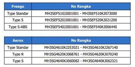 Pemanggilan 2 tipe skutik ini, nggak berlaku pada semua produksi. Hanya dengan kode sasis / rangka tertentu. Yaitu Freego tipe standar, tipe S dan tipe S-ABS, serta Aerox tipe standar, tipe R dan tipe S. Berikut kode rangka yang mengalami proses pemanggilan oleh Yamaha