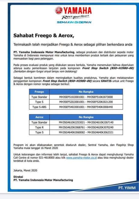 Ada kabar nih dari PT Yamaha Indonesia Motor Manufacturing (YIMM). Terhitung sejak kemarin, Senin 16 Maret 2020, PT YIMM menghimbau para pemilik Yamaha Freego dan Yamaha Aerox dengan nomor rangka tertentu untuk datang ke bengkel resmi Yamaha.