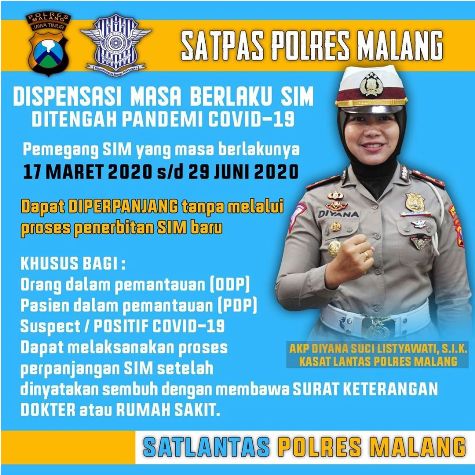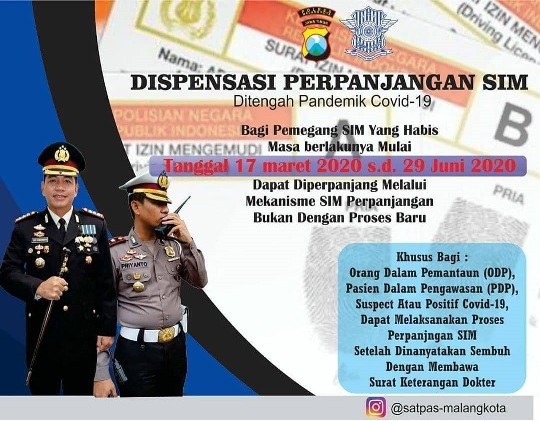 Nah, yuk diinfokan buat warga Kota Malang dan Kabupaten Malang, yang kebetulan masa berlaku SIM-nya pada periode ini serta masuk dalam kategori ODP, PDP atau pasien covid-19. Tenang, hak masbro dan mbaksis tentang SIM dijamin oleh pihak kepolisian.