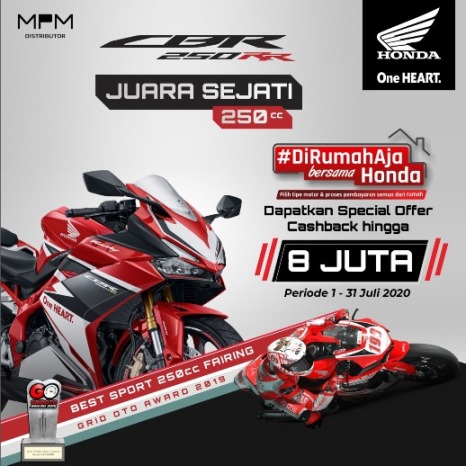 Pada bulan Juli ini, MPM Honda memberikan cash back hingga IDR 8 juta. Promo penjualan ini berlaku khusus untuk pembelian Honda CBR250RR. Asyik nih, hemat 8 juta, yang bisa dialokasikan untuk kebutuhan yang lain. Misal aja, buat memperganteng si CBR250RR tuh, bakal beli sembako modifikasi