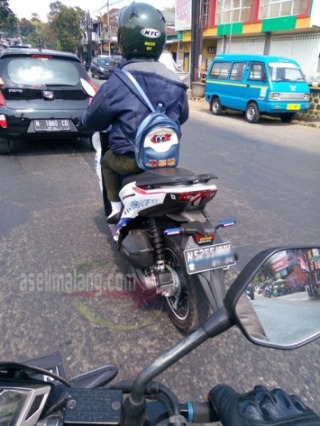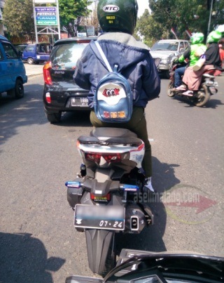 Salah satu yang simpel, namun menurut saia rada beresiko, adalah melapis stiker pada lampu sein. Setelah tren melapis stiker gelap pada mika lampu depan dan belakang, lampu sein juga kebagian ternyata. Gambar berikut saia ambil dan alami saat melintas di area Sukun, kota Malang. Sesosok Honda Vario, yang dikendarai bikers wanita menyalip saia dari sisi kiri. Setelah posisi didepan saia, selang beberapa saat, tetiba nih skutik mengambil jalur kanan, dan terpantau hendak berbelok, menyeberang ke sebuah RS di sisi kanan.