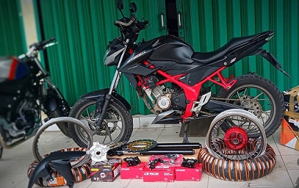 Modalnya, cukup datang ke gerainya om Yusa, spesialis kaki-kaki kekar. Dulu sih, akrab disapa gado-gado tapak lebar, gegara suka ubah tampilan motor jadi kekar pada kaki-kaki. Dan seperangkat perkakas pengganti pun, segera tersedia. Tuh, intip saja jajanan Honda New CB150R ini