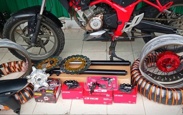 Sementara cakram belakang, masih cukup andalkan cakram aslinya CB150R. Untuk urusan jari-jari, nggak riber dengan tebus seperangkat jari-jari TDR yang tinggal rakit saja.