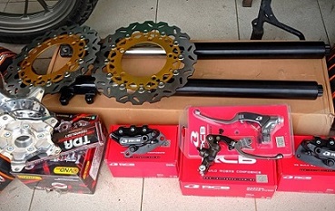 Perangkat lain yang turut diganti adalah 1 set perangkat rem merk RCB untuk rem depan. Mulai tuas rem RCB, master rem RCB hingga kaliper bermerek sama. Master RCB yang ini punya ukuran lebih gede sehingga mampu menekan cakram ganda di depan. Tampilan keren dapat, rem pun berfungsi maksimal