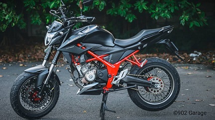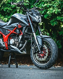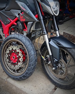 Hal ini dilakoni pula oleh pemilik Honda New CB150R ini. Pingin bergaya ala touring, namun ogah tampil mencolok. Cukup pingin kekar di roda, tinggi, namun lebih nyaman dan empuk dipakai di beragam tipe jalan. Alhasil, aliran velg ruji dipilih menggantikan velg orisinal CB150R yang berpalang 10