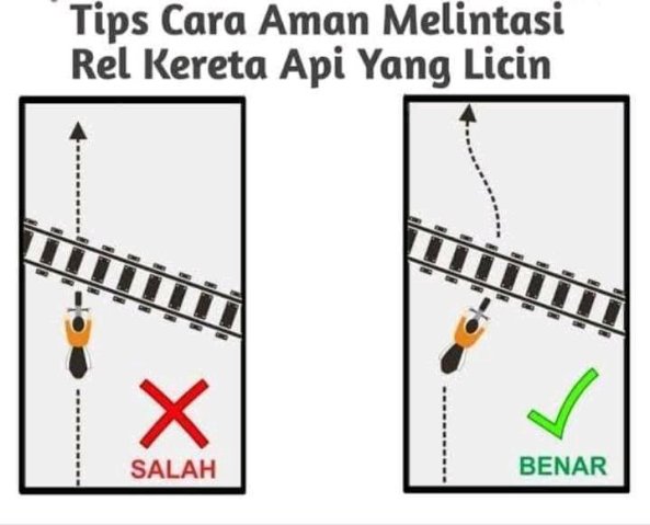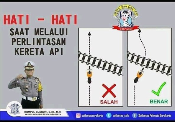 Sebagai himbauan dan penanda, di beberapa titik rawan laka seperti ini, terpasang petunjuk cara melintasi perlintasan KA secara aman.