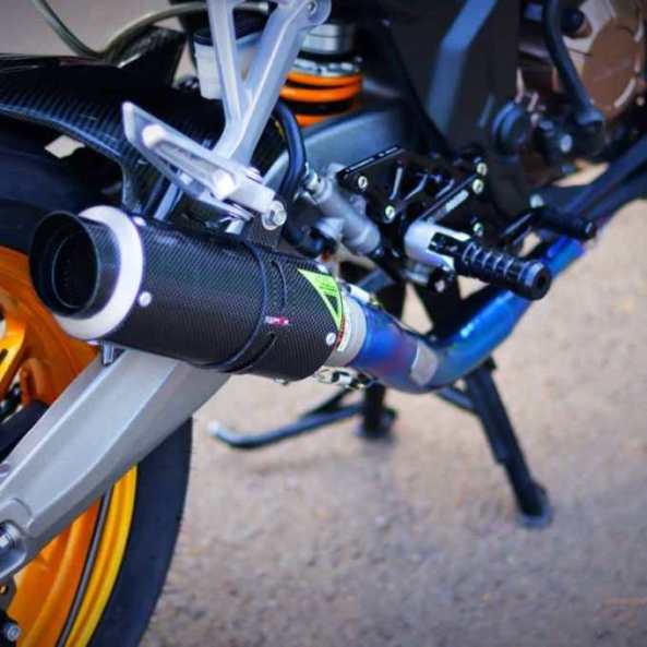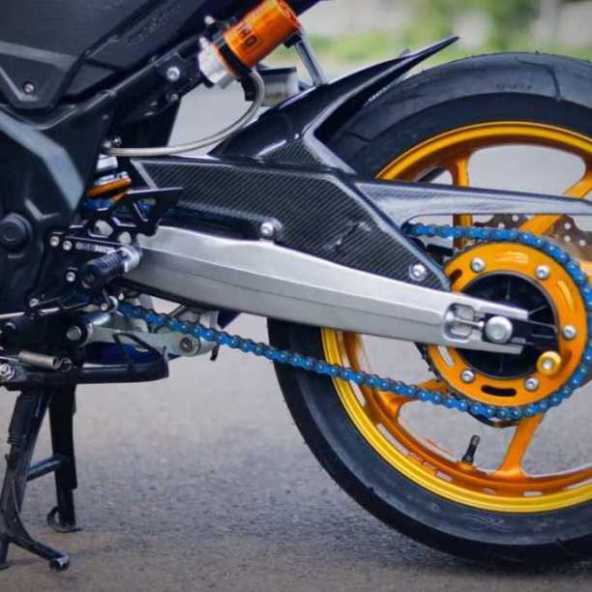 Untuk pijakan kaki pengendara, makin sporty dnegan model underbone keluaran NUI racing Monster black. Piranti penerus daya ke roda kekar, dipilih paduan girset SSS kelir biru ukuran 520 dengan perbandingan gir 13/41. Pelepas gas buang, tampil sederhana dengan header knalpot custom berkelir biru, dipadu dengan silincer Corse Project yang penedek. Pasti menggelegar nih, hehehehehe
