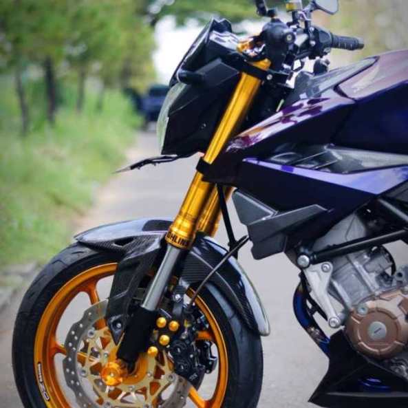 Velgnya sendiri, kombinasi lebar belakang 4 inchi dan depan 2,75inch yang berkelir mencolok, emas a.k.a gold. Velg ini dipasangkan dengan ban ukuran 110/70-17 untuk roda depan dan ban 160/60-17 untuk roda belakang.