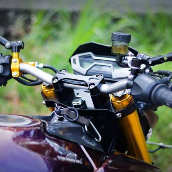 Suspensi depan, seirama juga nih. Pilihan upside down lansiran NUI Racing berwarna emas, pasa banget menggantikan sokbreker teleskopik NCB. Sebagai pengimbang pengereman yang sudah menggunakan cakram ganda, gede pula, piranti keliper serta master juga wajib diganti. Kaliper depan, gunakan kaliper KTC yang pakai 4 piston. Jadi, total rem depan punya 8 piston tuh, wedyan kan?? Makanya, master wajib ganti yang gede juga supaya mampu menyuplai tekanan minyak rem. Pilihannya adalah master RCB tipe S1 yang punya ukuran 17mm.