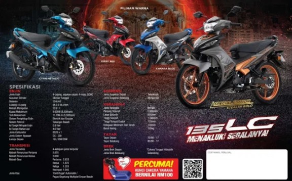 Masih mengusung nama resmi MX135LC, versi bebek super ini memang masih diminati konsumen disana. Dengan spesifikasi mesin 135cc SOHC, 4 katup dengan sistem injeksi dan pendingin cairan, serta power 12,1PS dan torsi 11,7Nm. dipadu bobot motor lumayan ringan yakni hanya 105kg, pljus dengan ukuran ban depan rada mungil yaitu 70/90-17 depan dan 80/90-17 untuk belakang, jadi kombinasi yang disuka bikers Malaysia. Nggak heran, lumayan banyak peminatnya dan laris di negeri jiran.
