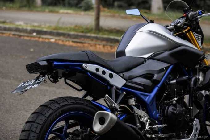 Ubahan paling kentara, adalah sasis belakang yang sedikit dipangkas dan ditekuk sehingga buritan MT-25 jadi ringkas. Ubahan ini, sekaligus melepas bodi belakangnya, sehingga hanya tersisa besi sasis belakang, yang dipasangkan plat besi galvanis bermodel lubang-lubang, menggantikan bodi belakang. Nah, sudah mirip tampilan ala XSR kan?
