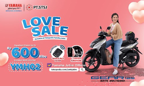 Promo Love Sale , dihelat PT. Surya Timur Sakti Jatim (Yamaha Jatim) untuk pembelian motor Yamaha di toko online, yaitu di Tokopedia. Semua konsumen yang bertransaksi di tokopedia, bakal diganjar diskon hingga 600 ribu. Caranya cukup dengan memasukkan kode “YMH02” pada kolom kode voucher dan harga awal akan otomatis terpotong saat hendak melakukan pembayaran.