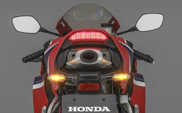Di belakang, kesan ramping didapat berkat desain knalpot ringkas dengan lubang knalpot yang terletak di tengah untuk yang menjadi ciri khas CBR600RR.