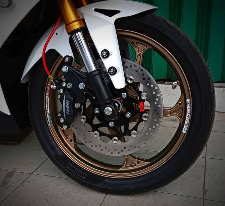 Suspensi depan masih andalkan orisinal bawaan Yamaha R15 V3 yang sudah bermodel USD alias upside down dengan warna tabung emas. Cucok nih sama velgnya, mashoook… Sementara piranti pengereman mendapat sedikit upgrade yaitu pemasangan master produk RCB dengan ukuran besar dan tabung terpisah. Disalurkan dengan slang rem baja, menuju kaliper gede 4 piston keluaran Nissin yang bertugas menghentikan piringan cakram PSM model floating