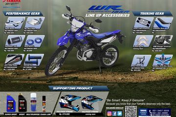 Yamaha, sebagai penunjang aktifitas pemilik WR155 R yang jelas nih, suka trabas, telah menyiapkan beberapa aksesoris resmi, alias genuine. Terbagi dalam 2 peruntukan, yaitu untuk penunjang performa atau performance gear, serta penunjang aktifitas trabas alias touring gear