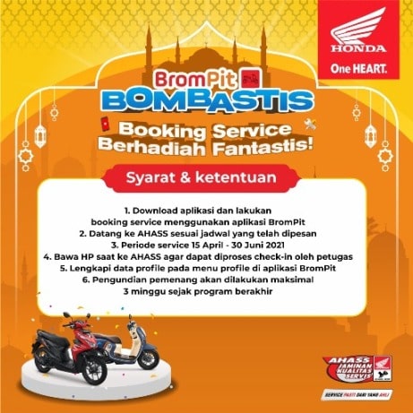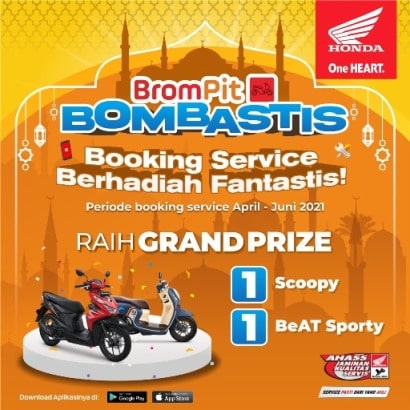Konsumen yang melakukan booking service melalui aplikasi Brompit akan mendapatkan tambahan keuntungan dan berkesempatan memenangkan hadiah berupa motor yang dikemas dalam program Brompit Bombastis. Segera manfaatkan layanan booking service tanpa antri melalui aplikasi Brompit. Selain memberikan kemudahan dalam kebutuhan perawatan motor Honda kesayangan, konsumen juga akan berkesempatan memenangkan hadiah 1 unit Honda Scoopy dan 1 unit Honda BeAT Sporty yang akan di undi di akhir periode. Undian booking service ini berlaku selama periode 15 April – 15 Juni 2021.