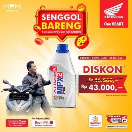 Saat ini , lagi ada agenda heboh nih, yaitu promo menarik melalui BROMPIT buat konsumen HONDA yakni promo SENGGOL BARENG (SEmarak NGGanti OLi Bareng), dimana konsumen yang melakukan ganti oli akan mendapatkan promo harga spesial oli MPX2 dengan harga hanya IDR 43.000,-. Promo menarik yang menguntungkan bagi konsumen ini berlaku dari 1 Juni s.d 31 Juli 2021 di seluruh jaringan AHASS Jawa Timur. Pada aplikasi Brompit juga terdapat voucher diskon oli dengan menunjukkan voucher yang ada di aplikasi Brompit kepada petugas AHASS untuk melakukan klaim voucher diskon oli MPX2.