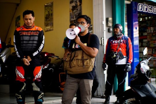 Dan tak berapa lama, rombongan sudah komplit, ada 10 orang kades yang gabung. Ditambah 3 orang dari pemandu, terdiri 1 leader/road captain, serta sweeper sehingga total anggota rombongan berjumlah 15 orang. Ada briefing singkat oleh mas RC, yang memberikan beberapa tips saat melibar jalur off road, seperti posisi badan , mengikuti jalur/lintasan trail yang sudah ada serta yang penting juga, melibas kubangan lumpur. Maklum, beberapa hari belakangan, hujan mengguyur Malang dan sekitarnya. Dan pesannya ada yang menggelitik, kalau memang gak kuasa handling motor, jatuhkan saja ke sisi kanan. Jadi , kalau mau jatuh, kalau bisa ke kanan. Nah lho…hingga berangkat saia masih menerka-nerka, apa maksudnya mas RC ini