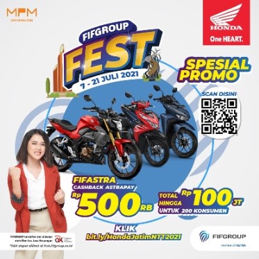 Pada Pameran Virtual Honda yang dimulai tanggal 7-21 Juli 2021 ini MPM Honda Jatim dan FIF memberikan penawaran menarik berupa hadiah langsung Saldo Astra Pay @500rb, total hingga 100JT untuk 200 orang pembeli pertama kredit melalui FIF