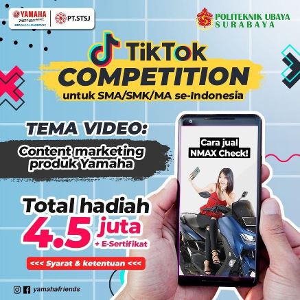 PT Surya Timur Sakti Jatim (STSJ) sebagai distributor resmi motor Yamaha Jatim bersama dengan Politeknik Ubaya menyelenggarakan Tiktok Competition untuk siswa-siswa SMA/SMK/MA se-Indonesia dengan tema video Content Marketing produk Yamaha.