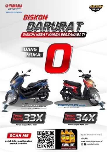 Yamaha Jatim memberikan Diskon Darurat (Diskon Hebat Harga Bersahabat) bagi pelanggan setia Yamaha. Dengan Rp 0 kamu bisa membawa pulang motor idamanmu dari Yamaha. Kapan lagi bisa membawa pulang motor tanpa mengeluarkan sepeser pun.