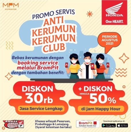 dapatkan diskon jasa service lengkap Rp 30.000,- dan tambahan diskon Happy Hour hingga 50%. Program ini berlaku pada periode bulan Agustus dan untuk wilayah Pasuruan, Probolinggo, dan Lumajang. Untuk informasi dan lokasi AHASS dapat dilihat pada aplikasi Brompit.