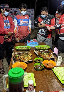 Singkat cerita, finish di areal pesisir laut kabupaten Malang yang sekaligus berkemah disana. Sabtu malam, diisi seremonial potong kue ulang tahun Jatimotoblog yang dilanjutkan makan malam bersama, nongkrong dan berbagi cerita yang gak habis-habis, padahal yakin, badan pasti capek-pegal-linu dihajar jalur offroad.