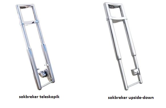 Suspensi, atau sokbreker pada sepeda motor punya fungsi vital, yaitu utama meredam getaran dan benturan akibat jalan tak rata. Perangkat kenyamanan ini, biasa terpasang pada bagian depan dan belakang motor. Sokbreker depan sendiri, sesuai tren dan kemajuan terkini, kini ada 2 model yang paling banyak diaplikasi yaitu sistem teleskopik konvensional serta sistem upside down/USD. Ndak usah mikir model lawas macam springer, cangkrang dan lain-lainya yaa π