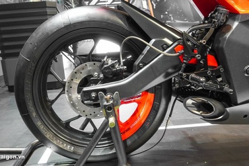 Yang menarik area kaki-kakinya begitu garang dan kekar. Suspensi depan model USD alias upside down, yang dikombinasi velg dan ban lebar. Apalagi, model ban yang terppasang bertipe slick yang identik dengan balap. Kesan kekar juga hadir di area belakang yang menggunakan model lengan ayun melengkung model banana dan knalpot ringkas tipe underbelly. Makin asyik lagi kala melongok suspensi monosoknya yang bermodel tiduran, weh..