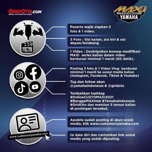 Pendaftaran Customaxi 2021 dibuka hingga 21 November 2021, masbro bisa mendaftarkan diri melalui http://www.customaxiyamaha.com. Untuk informasi lebih lanjut mengenai event Customaxi dapat mengikuti Instagram resmi Yamaha STSJ @yamahafriends. Pertanyaan mengenai Customaxi 2021 dapat menghubungi CS Yamaha STSJ di 08228 – 7777- 898.