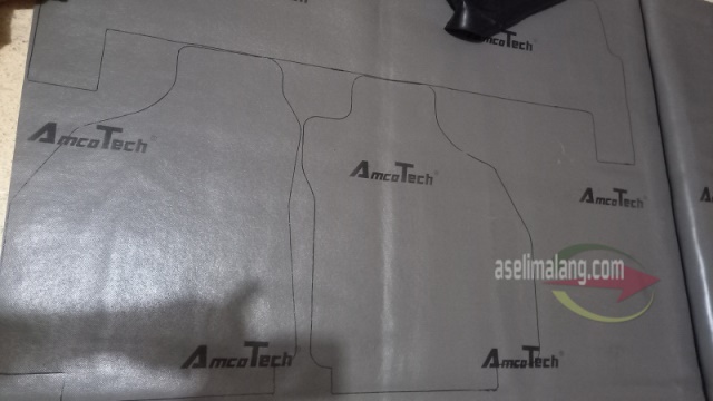 Usai tergambar pola, tinggal potong deh. Awalnya takut juga, kesulitan motongnya. Ternyata, berbekal nekat dan pisau cutter yang tajam, alas karet ini mudah banget dipotong. Intinya, jangan ragu ya masbro..