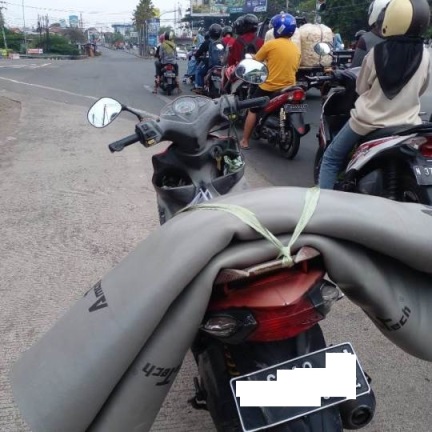 Meski awalnya rada kuatir karena harga di bawah pasaran, saia nekat juga CODan. Pilihan warna yang tersedia hanya biru dan abu-abu, yang akhirnya menjadi pilihan saia. Saia pesan panjang 3 meter setelah mengukur kasar dan mengira-ira panjang lantai Kijang Kapsul si Silvy. Singkat cerita, COD beres dan segulung karpet bihun saia bawa pulang. Ternyata nggak mengecewakan, sesuai ekspektasi malahan. Tebal sekitar 1,8 cm dan bahan bagus. Kalau ukuran lebar, adalah 1,2 meter, sehingga saat dibawa pulang digulung diatas motor masih muat