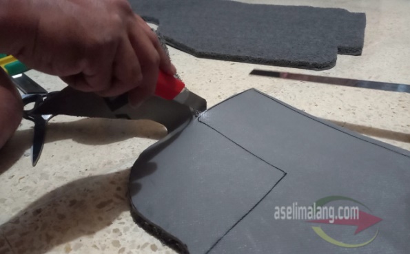Usai tergambar pola, tinggal potong deh. Awalnya takut juga, kesulitan motongnya. Ternyata, berbekal nekat dan pisau cutter yang tajam, alas karet ini mudah banget dipotong. Intinya, jangan ragu ya masbro..