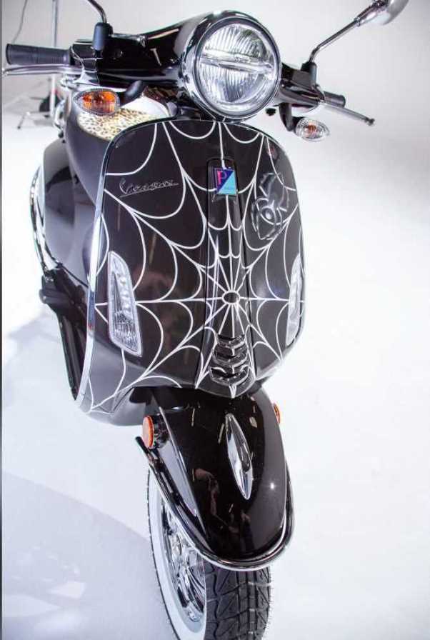 Sosok Elvira Macabre ini memang terkenal dan muncul julukan sebagai Mistress of The Dark yang memiliki penampilan unik dan eksentrik. Maka dari itu, pada edisi terbaru ini Vespa Los Angeles meracik tampilannya dengan konsep desain yang terlihat mistis. Warna dominan hitam gelap, dilabur grafis sarang laba-laba warna putih, dan masih ditambahkan penyematan emblem 40 tahun perayaan Elvira Macabre di beberapa area, seperti di balik panel body depan dan di bagian jok belakang. Lalu pada bagian joknya menggunakan lapisan kulit dan dibalut dengan motif leopard di bagian tengah. Grafis laba-laba juga nongol di sisi kiri panel bodi depan