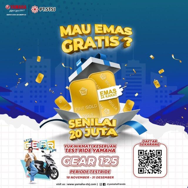 Kali ini, Yamaha STSJ bagi-bagi emas gratis kepada pelanggan setia Yamaha. Nggak pakai ribet, hanya dengan melakukan test ride motor Yamaha Gear 125, pelanggan berkesempatan membawa pulang emas 24K senilai Rp 20 juta.