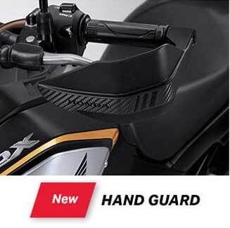 Lanjuuut… Penunjang tampang gahar sekaligus melindungi tangan pengendara, ada hand guard nih. Berbahan Nylon PE6 berwarna hitam, siap dipasang didepan setang CB150X. Paket penjualan hand guard ini termasuk baut di area weight balancer yang dibanderol lumayan, IDR 450.000