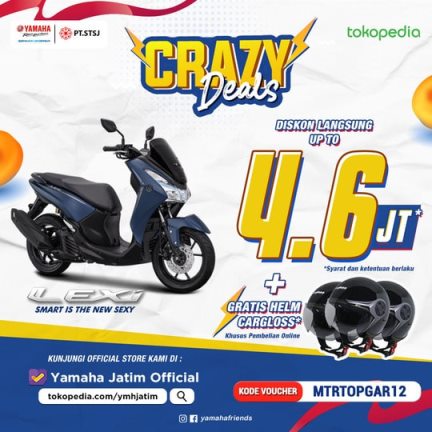 Selain memperoleh diskon lumayan, pembeli melalui Tokopedia, juga bakal diganjar hadiah langsung nih. Yaitu helm Cargloss setelah menyelesaikan transaksi secara online. Konsumen bisa menikmati potongan harga jika melakukan pembelian melalui Official Store Yamaha Jatim di Tokopedia dengan menggunakan kode voucher MTRTOPGAR12