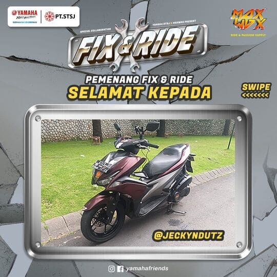 Sebuah program kolaborasi unik dihelat oleh PT. Surya Timur Sakti Jatim (Yamaha STSJ) yang menggandeng Maxwax Communal Space. Yaitu, tawaran untuk memodifikasi total unit Yamaha Aerox milik konsumen Yamaha Jatim secara gratis bertajuk Fix and Ride. Weleh..