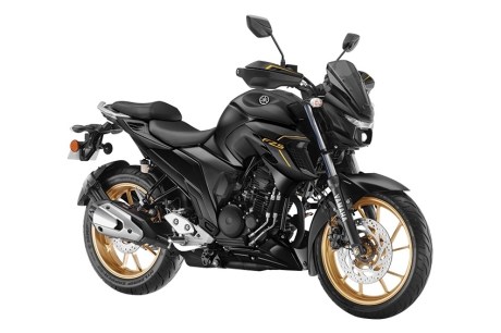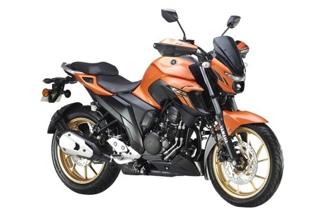 Yamaha India menyiapkan 2 pilihan FZS, yaitu tipe standart/FZ25 dan tipe FZS25. Tipe kedua, kalau di Indonesia mungkin dinamakan SE sudah dilengkapi visor diatas lampu depan serta handguard pada setangnya. Plus, velg dikelir emas sehingga tampak lebih eksklusif. Harganya, kalau dirupiahkan sekitar IDR 28 jutaan saja, hehehehe dengan pilihan warna hitam dan oranye/tembaga