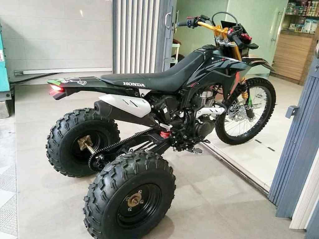 Yups, dengan tampilan bodi yang nyaris standar, nih CRF mengalami modifikasi lumayan ekstrim. Yaitu ubah roda belakang menjadi 2. Wah, ala-ala ATV kan ya, roda belakangnya gede dan berbatik kasar khas offroad.