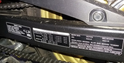 Nah, yang paling pas adalah sesuai standar pabrikan. Alias, nggak kelewat keras, dan juga nggak kurang tekanan angin ban. Pas. terus tahunya pas dari mana? Eh, di motor masing-masing, sudah ada patokan kok. Intip saja di lengan ayun alias swing-arm, sudah ada keterangan berupa stiker, yang berisi panduan tekanan angin ban, ukuran ban rekomendasi dan beberapa himbauan penting lain