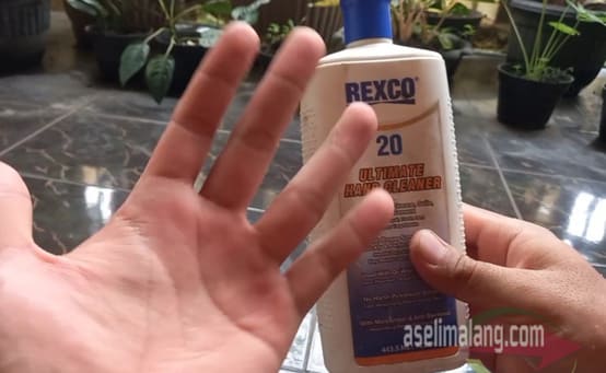 Cukup tuangkan si Rexco 20 ini ke tangan yang hendak dibersihkan. Lanjut mengosok-gosokkan hingga cairan kental putih ini rata di seluruh bagian. Bila perlu, gosok agak keras apabila ketemu kotoran atau noda yang membandel atau tebal.