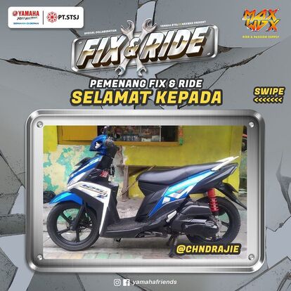 Yamaha STSJ Jatim akhirnya mengumumkan pemenang Fix & Ride season 2. Melalui akun instagram @Yamahafriends, telah dinyatakan bahwa pemilik akun instagram @chndrajie asal Surabaya berkesempatan mendapatkan restorasi motor gratis dari Yamaha STSJ.