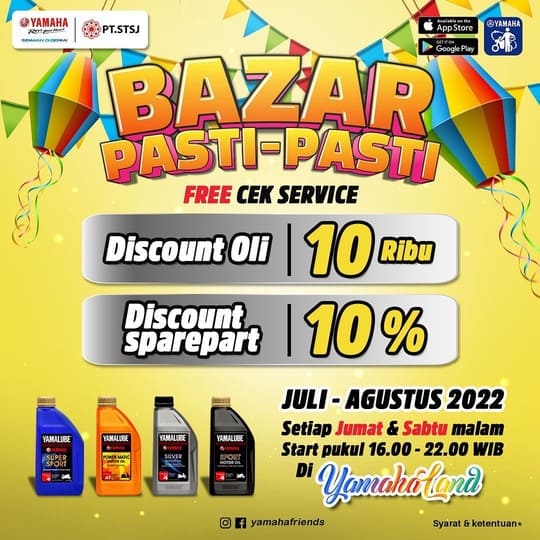 Selain itu, Yamaha STSJ menyiapkan promo potongan pembelian oli sebesar Rp 10 ribu serta potongan pembelian sparepart ASLI sebesar 10% (kecuali Busi dan Aki). Konsumen juga bisa menikmati cek service kendaraan secara gratis. Nantinya, kendaraan akan di cek oleh teknisi ahli dari Yamaha.