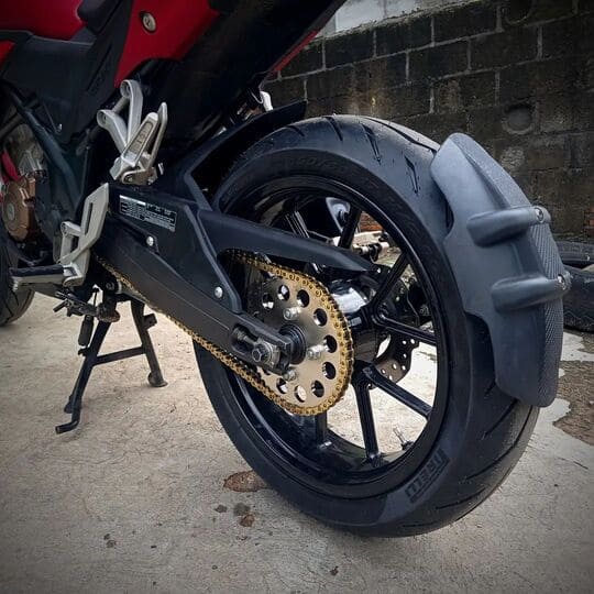 Sebelumnya, lengan ayun sudah dikanibal. Swing arm bawaan NCB dicopot, diganti swing arm Honda CBR250RR tricolor black. Lebih kekar dan lebar, sehingga muat saja diisi kombinasi velg lebar berikut ban gendut. Berkat garapan 902 Garage, lengan ayun ini bisa masuk dan duduk sempurna di sasis NCB. Asyiknya, perangkat rem cakram belakang bawaan NCB bisa tetap dipakai tanpa perlu ubahan apapun. Mulai kaliper, braket kaliper hingga piringan cakram belakang bisa dipakai kembali.