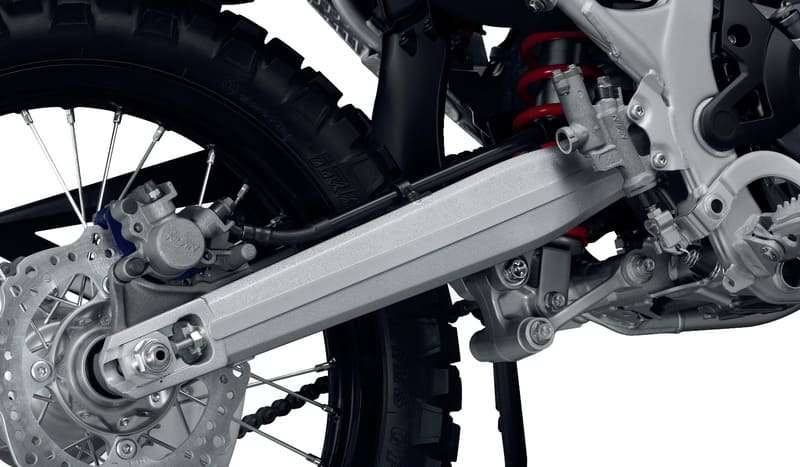 Kaki-kaki mantap khas motor trail dengan suspensi depan upside down Showa 43 mm dan kombinasi monosok pro-link showa juga yang dipasangkan pada lengan ayun alumunium